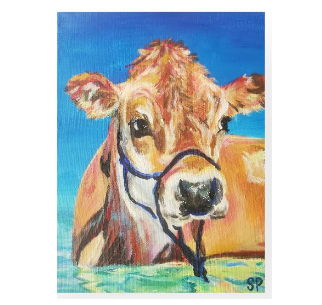 Inspired by the serene beauty of the Channel Islands, this painting features Jersey the cow enjoying the sea, blending the calm of the beach with the gentle, lovable nature of this iconic breed. The soft colors and peaceful scene make it a perfect addition to any living space, office, or studio.